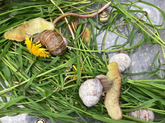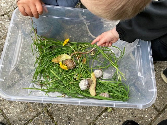 I dag var en af sneglene blevet væk. Vi ledte efter den og bagefter legede vi gemmeleg. Til frokost skal vi have pesto snegle, “rigtig snegle mad “